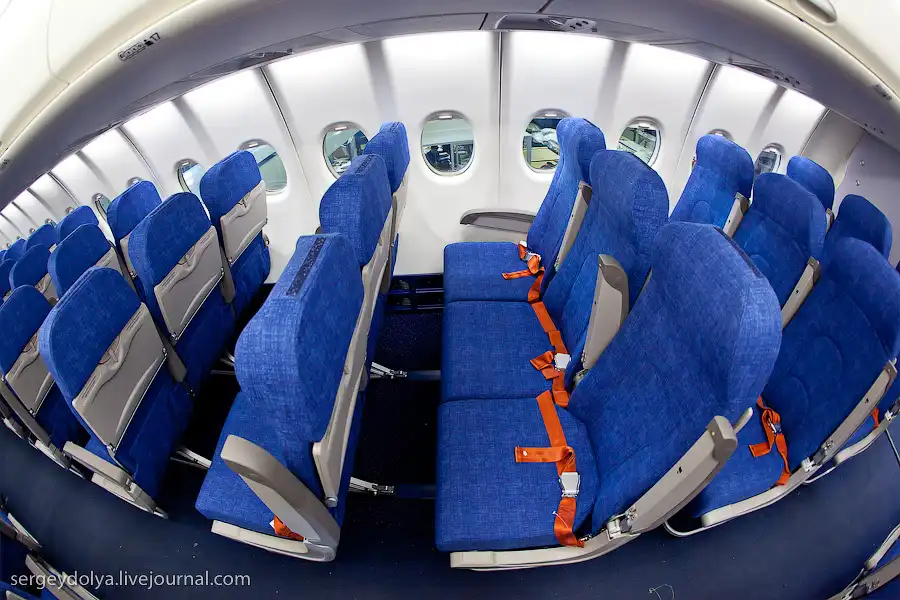 До завершения работ салон закрыт специальными чехлами, чтобы не повредить перед сдачей заказчику. Обратите внимание на место для ног у пассажиров первого ряда экономического класса. Если когда-нибудь будете летать на Суперджете, просите первый ряд: