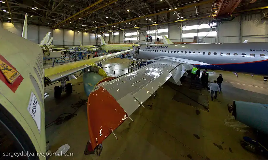 Если в предыдущем цехе Сухого самолет буквально выстругивали из куска алюминия, то в цехе, о котором я расскажу сегодня, в него вдыхают жизнь. Здесь самолету дарят крылья, авионику, двигатели и салон, после чего он впервые в жизни взмывает в небо... (с) sergeydolya