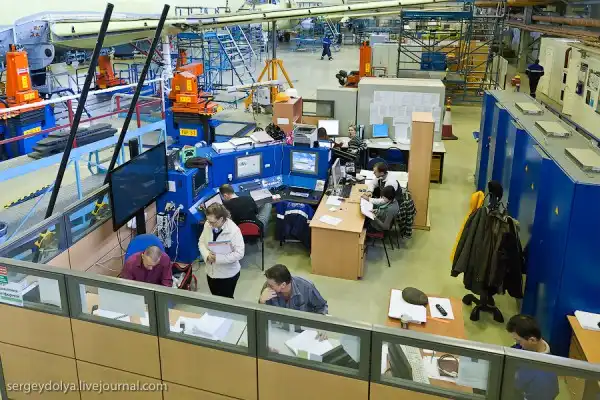 Управление всеми процессами сборки идет из огороженных зон - точно такие же я видел на заводе Боинга:
