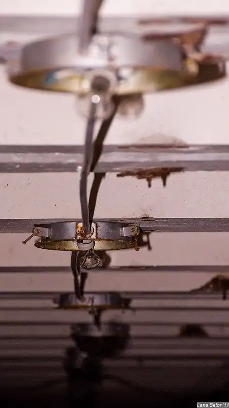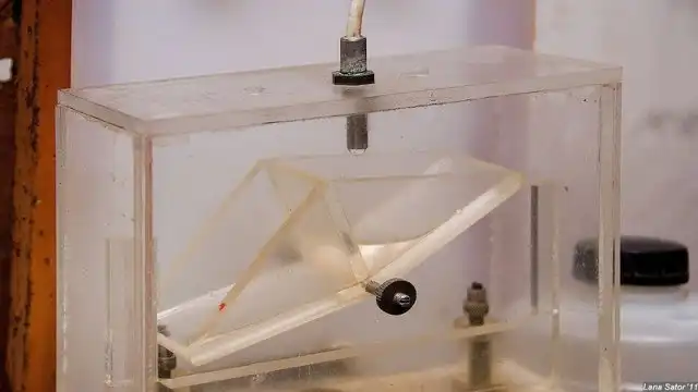 Когда ванночка наполняется, тяжесть воды ее опрокидывает - со звуком "бум".