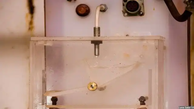 Вода выплескивается на дно прямоугольного ящичка со звуком "плюх" и утекает в трубку, после чего попадает в канистру. канистры многие переполнены, отчего выливающаяся лишка обрушивается на пол с характерным "пыщ".