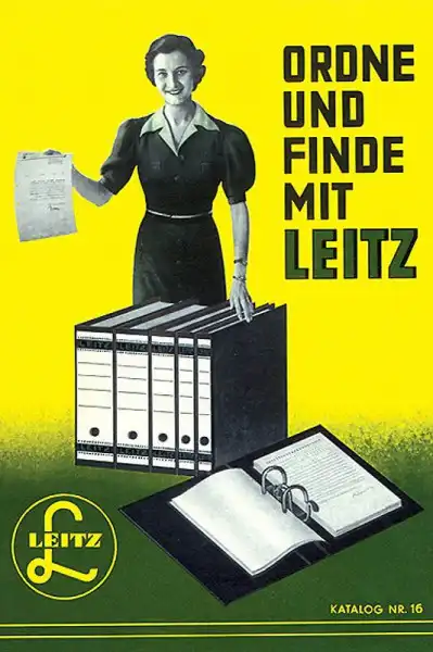 Механизм скоросшивателя почти не изменился со времени изобретения Фридрихом Зоннекеном в 1886 году и модификации Луиса Ляйтца в 1896 году. Хотя сейчас все больше и больше документов хранится в цифровом формате, скоросшиватель остается важным инструментом и символом работы в офисе. Надпись на фото переводится как “Упорядочивать и находить с Leitz” (Leitz)