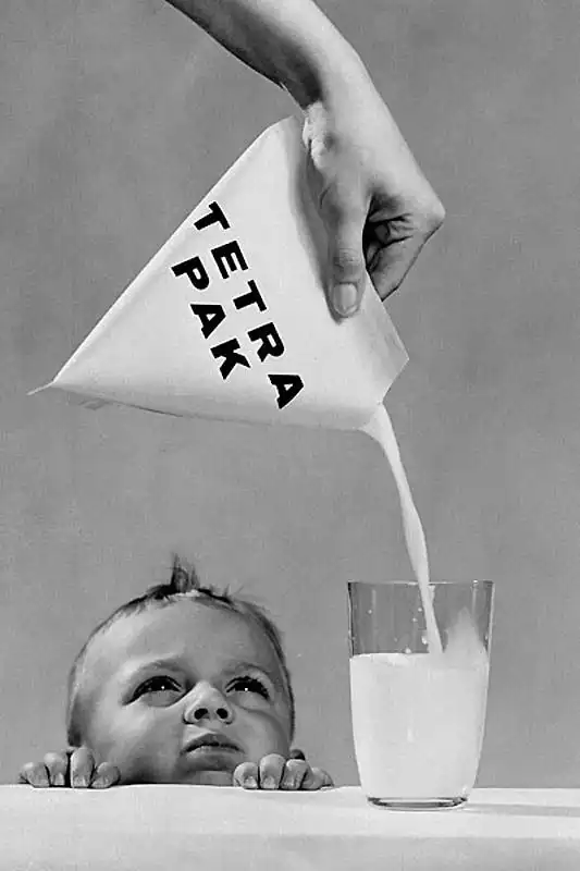 Долгое время стандартом являлись стеклянные бутылки, но усовершенствования в упаковочной промышленности США в 1940 годах вдохновили шведского бизнесмена Рубена Раусинга на поиск альтернативы. Он разработал метод создания герметичных сосудов из специального картона и их запаковки. Технология получила название Tetra Pak – так же назывался и влагостойкий картон. В конце 1960-х годов такая упаковка стала стандартной для хранения непортящегося молока. (Tetra Pak)