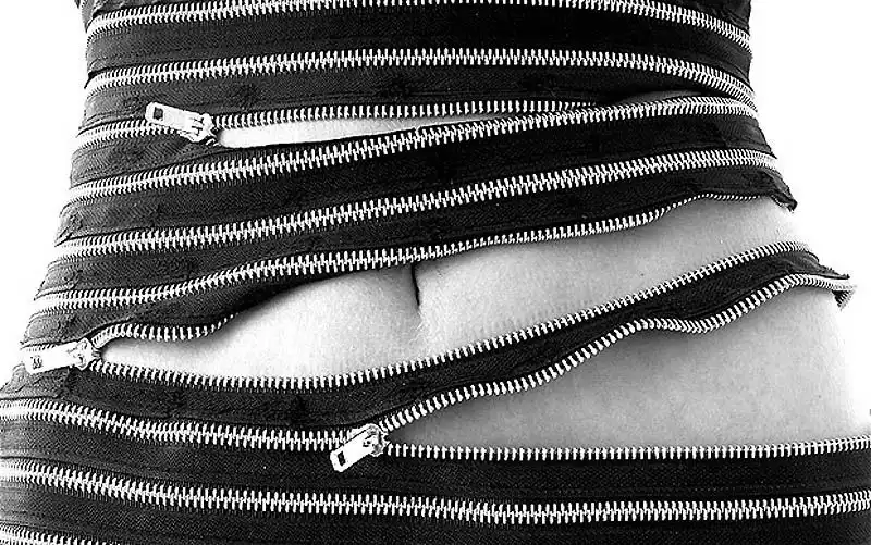 Эта застежка проста в использовании, но имеет достаточно сложную конструкцию и принцип работы. Бегунок соединяет зубья по обе стороны – у них выпуклая верхняя часть и вогнутая нижняя, – так, чтобы они лежали в вертикальном ряду в шахматном порядке. Чтобы расстегнуть молнию, бегунок приподнимает зубья, чтобы они рассоединились. Швед Гидеон Сандбэк потратил годы на усовершенствование конструкции. (Sebastian Errazuriz)