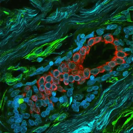 Красная зона – млечные протоки, окруженные соединительной тканью, результат биопсии пациента с раком груди. Соединительная ткань – зеленого цвета, а коллагенные волокна – бирюзового цвета. Фото: Артур Чиен, Элли Кейбл и Лилан Сунн, Университет Сиднея.