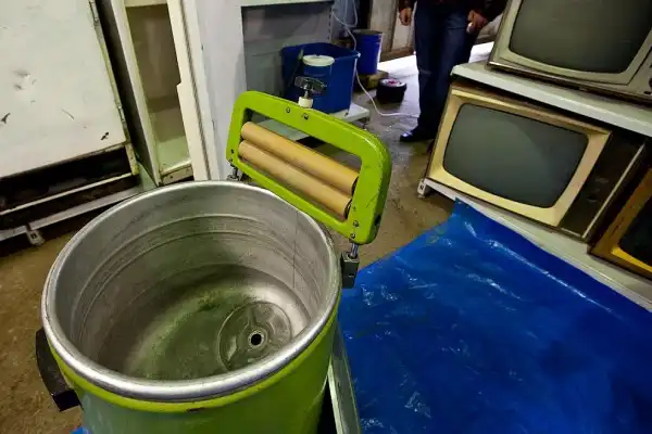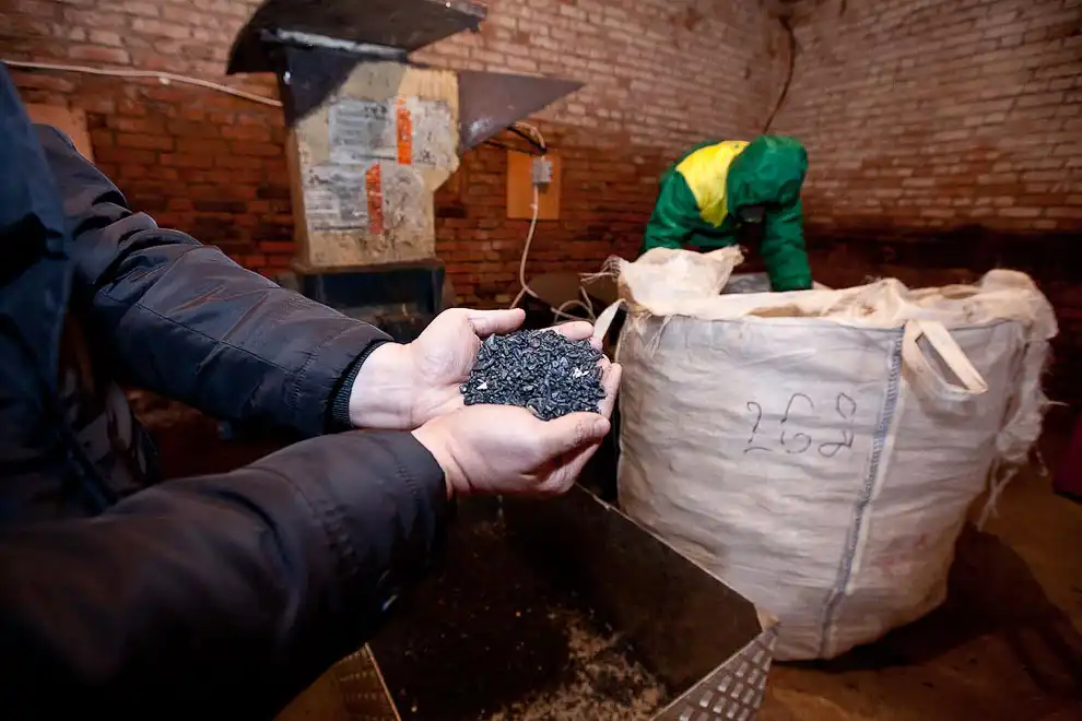А в такую крошку превращается пластмасса корпусов телевизоров и радиоаппаратуры. Предприятие пробует применять её при изготовлении бетонной плитки для тротуаров и кирпичей. Тоже самое происходит и со стеклом от мониторов — его дробят и добавляют в бетонный раствор: