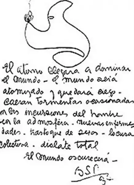 "Атом завладеет миром. Планета ослепнет. Человек спровоцирует случайные бури и природные катаклизмы, новые формы болезней, сексуальную беспорядочность, массовое помутнение рассудка, всеобщее отупение. Мир погрузится во тьму." (1934)