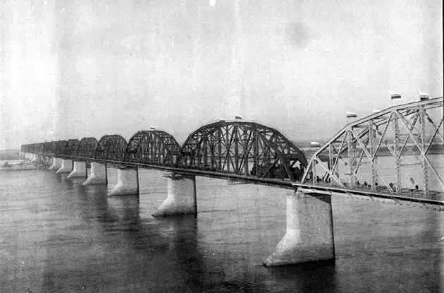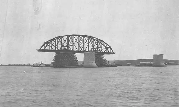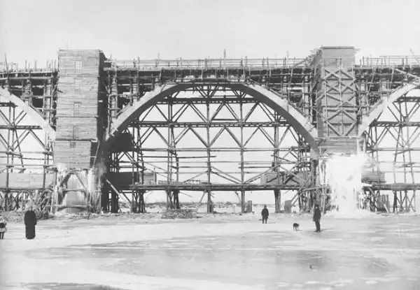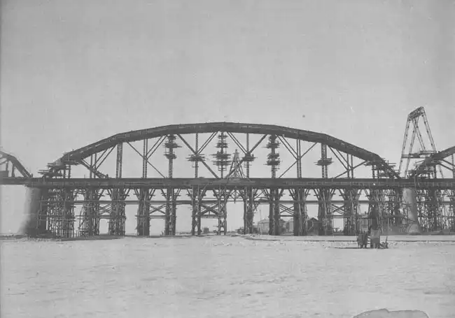 Сборка железных пролетных строений (всего - 18), доставленных в разобранном виде из Варшавы (завод акционерного общества "К. Рудзкий и К") южноморским путем (Одесса - Владивосток), производилась на месте строительства моста. Начало сборки: ажурные конструкции взмывают в высь.