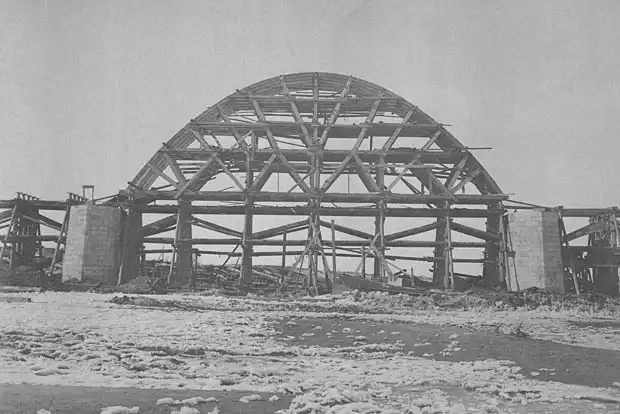 Готова очередная речная опора из 18-ти, напоминающая гигантский сапог (высота над уровнем воды - 17 м.). Выступ-ледорез с гранитной облицовкой в нижней части быка будет защищать мост в весеннее время от сокрушительной силы движущихся льдин.