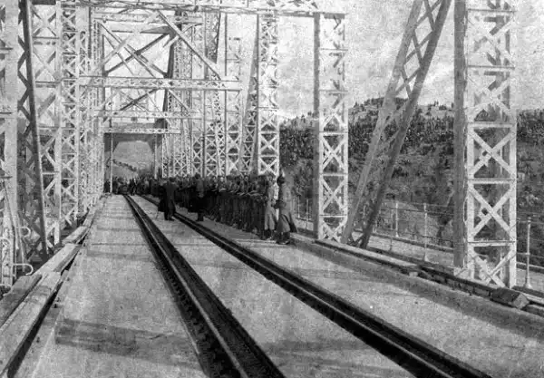 Первый поезд движется по мосту: заключительное звено Транссибирской магистрали замкнулось.