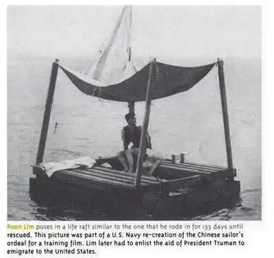 Пун Лим, кок затонувшего корабля, остался единственным человеком на типовом 25-местном спасательном плоту, имевшем 2-суточный запас питания и воды на экипаж. Влекомый течением и ветром, плот шел в неизвестность, а невольный матрос мигрировал заодно с ним. В жару китаец плавал, обвязавшись линем, и едва не угодил в акулью пасть, в дождь он собирал воду. Его меню разнообразили пойманные рыбешки, чайка и добытая самодельным крючком акула. Разделка хищницы велась таким же импровизированным ножом.