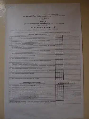 Тут бы и сказочке конец, но это было только начало. На часах 1:20 все формальности соблюдены, теперь по закону председатель должен провести итоговое заседание, рассмотреть поступившие жалобы и утвердить итоговый протокол голосования по нашему участку. Я уже немного расслабился ибо мне казалось, что основное дело сделано. Председатель действительно бойко командует о составлении протоколов в 2х экземплярах как положено. Комиссия их дружно подписывает я прошу чтобы мне выдали заверенную копию протокола, председатель говорит: "Конечно сейчас немедленно сделаем" и выходит из помещения для голосования с двумя протоколами. Забегая вперед скажу, что больше я его не видел. Но в этот момент мне кажется что дело в шляпе и я расслабляюсь минут 15 на стуле, проведя почти весь день на ногах. Бюллетени на столе в опечатаных конвертах, увеличенная копия протокола на стене, списки избирателей опечатаны в сейфе.