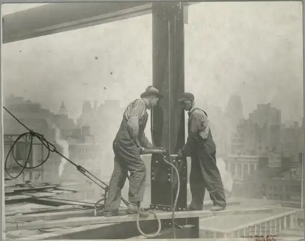 На помосте из досок, или просто на стальных балках стоит угольная печь. В печи заклепки - 10сантиметровые в длину и 3 сантиметровые в диаметре стальные цилиндры. "Повар" "варит" заклепки - небольшими мехами гонит в печь воздух, чтобы разогреть их до нужной температуры. Заклепка прогрелась (не слишком сильно - провернется в отверстии и придется ее высверливать; и не слишком слабо - не расклепается), теперь нужно передать заклепку туда, где она будет скреплять балки. Какая балка когда будет крепиться известно лишь предварительно, да и передвигать горячую печь в течение рабочего дня нельзя. Поэтому часто место крепления находится от "повара" метрах в 30ти (тридцати), иногда выше, иногда ниже на 2-3 этажа.