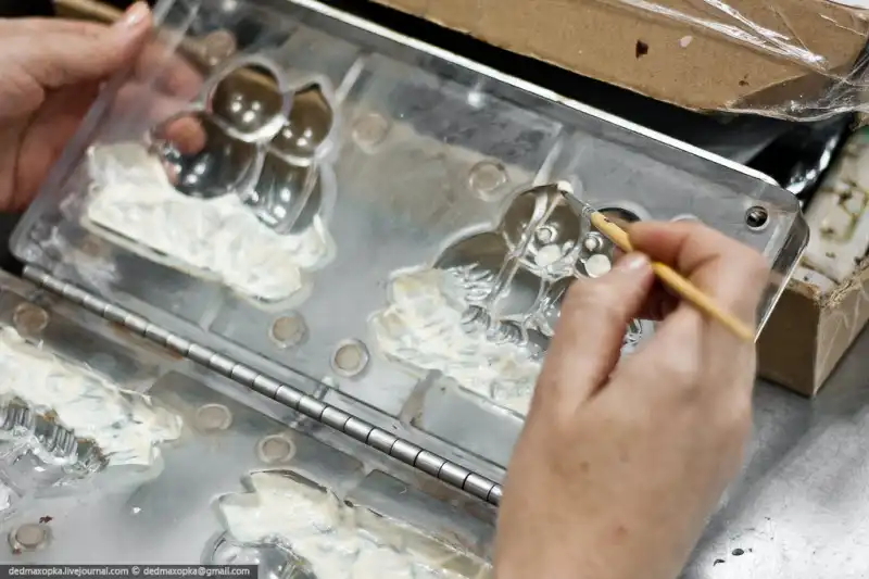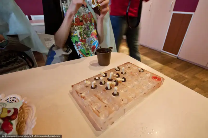 14. А вот так делают фирменные "грибочки". Сначала заливают форму шоколадом