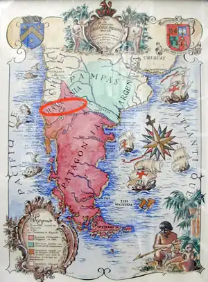Карта владений Антуана I. Красным кружком обведена территория, жители которой признавали Тунана своим королем. Земли вишневого цвета француз тоже объявил своими, но никакой реальной власти над ними не имел. Иллюстрация с сайта araucanie.com