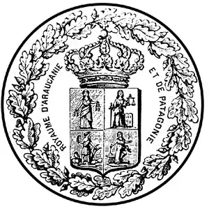 Герб государства Антуана. Официально оно именовалось королевством Араукании и Патагонии. На гербе четыре аллегорические фигуры: Справедливость, Свобода, Ремесло и Сельское хозяйство. Иллюстрация (Creative Commons license): Ayack