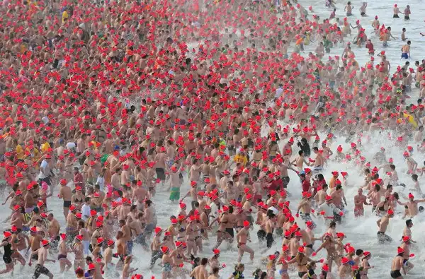 3. Голландские пловцы в ледяном Северном море в Шевенингене, Нидерланды. В Северной Америке клуб моржей помог популяризовать традицию купания в ледяных водах зимой. Бернарр Макфадден, основавший Клуб моржей Кони-Айленда в 1903 году, считал, что «купание в океане зимой поможет укрепить иммунитет и жизнеспособность». (Jasper Juinen / Getty Images)