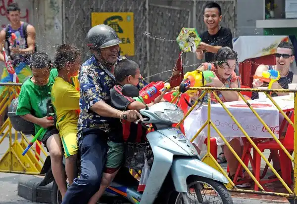8. Тайские дети и иностранные туристы обливаются водой во время фестиваля Сонгкран в Бангкоке. Сонгкран – тайский Новый год, который начинается 13 апреля. В это время года стоит жара, и люди отмечают праздник, обливаясь водой. Этот ритуал произошел от традиции обливать ароматной водой изображения Будды в знак очищения. Затем собранную «благословенную» воду выливали на членов семьи на удачу. (Pornchai Kittiwongsakul / AFP - Getty Images)
