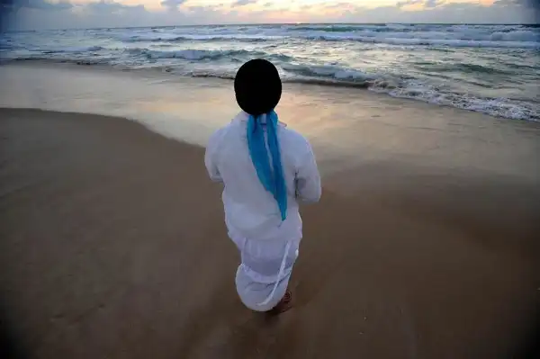 24. Еврейка практикует Ташлих в первый день еврейского нового года Рош Ха-Шана, в прибрежном израильском городе Ашдод. Ташлих – это ритуал долгого стояния, который проводят в полдень в новый год. По традиции, в море нужно бросать кусочки хлеба или другую еду, чтобы они унесли с собой грехи прошлого года. (Amir Cohen / Reuters)