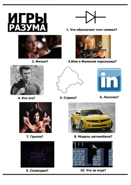 1 - Диод2 - Знакомьтесь Джо Блэк3 - Беатрикс Киддо4 - Клинт Иствуд 5 - Бразилия (перевернутая на 270°)6 - "LinkedIn"7 - Led Zeppelin8 - Шевроле Камаро9 - Лев10 - Принц Персии)