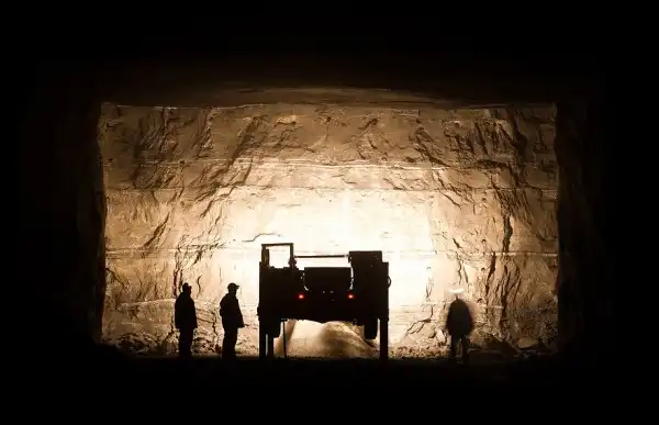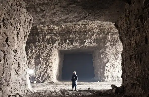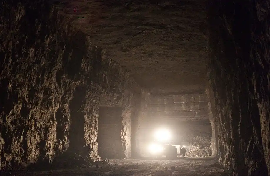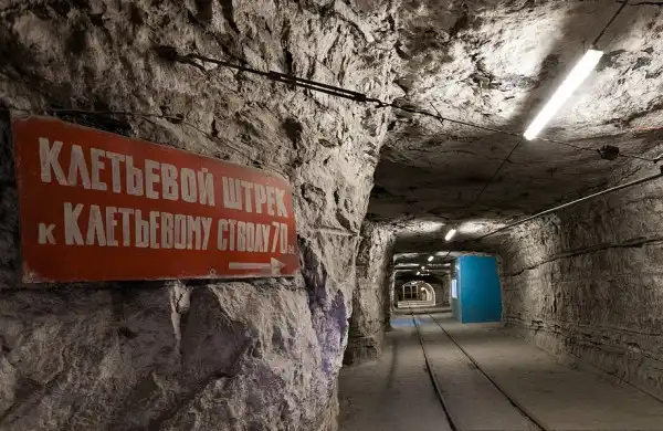 Спуск на 130 метров под землю. Добываемая порода - гипсовый камень, это 11-тиметровый слой на этой глубине.