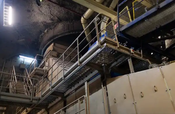 А потом на поверхность по вертикальной конвейерной системе по доставке дробленого гипсового камня. Производительность системы составляет 900 тонн камня в час, или 6480 тонн в смену.