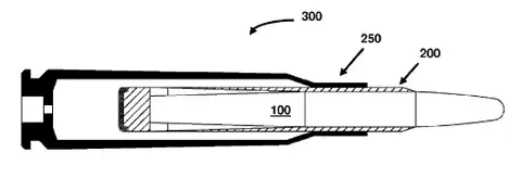 Патент на управляемую пулю указывает, что разработка нацелена на оружие калибра 0.50 (12,7 мм). На рисунке: 300 – патрон, 250 – гильза, 100 – пуля, 200 – сбрасываемая после выстрела оболочка, которая при прохождении ствола защищает электронную стрелу и обеспечивает сдерживание пороховых газов.