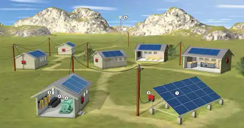Комбинированные системы генерации электроэнергии (альтернативные источники плюс ископаемое топливо) постепенно находят применение за рубежом. На рисунке показан примерный состав подобного комплекса. 1 – солнечная батарея, 2 – «солнечный» инвертор, 3 – инвертор для аккумуляторов, 4 — аккумуляторы, 5 – дизель-генератор, 6 – ветряк (иллюстрация с сайта sma.de).