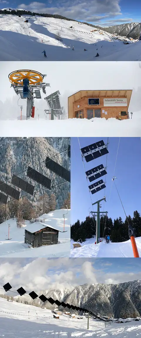 246 фотоэлектрических панелей системы Solarskilift Tenna сгруппированы по три шутки в 82 так называемых солнечных крыла. Они парят прямо над трассой подъёмника, будучи закреплёнными на тросах, протянутых над канатной дорогой.