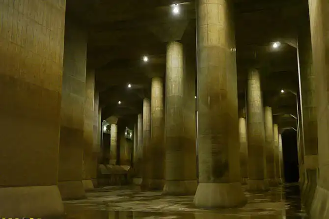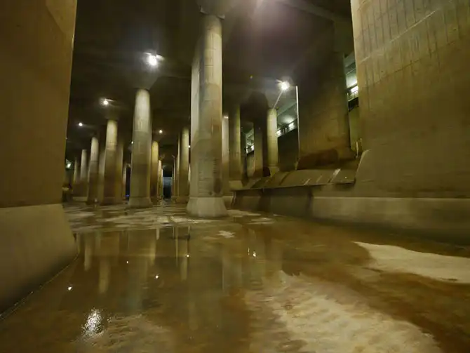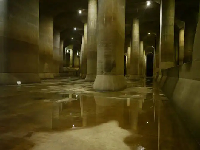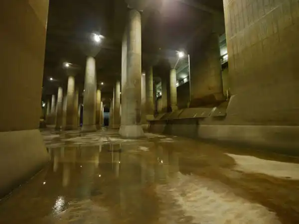 Все, наверное, видели уличную «ливнёвку» – дождевая вода стекает в решётки вдоль улиц и по трубам выносится в ближайшую реку. В Японском случае необходимо было построить примерно то же самое, но уже не в масштабах улицы, а города. Сооружение системы началось в 1993 году, и основные работы завершены в 2008. По состоянию на 2008 год в проект было вложено более 2 млрд долларов, но строительство и расширение системы продолжаются по сей день. На бетонирование ушло более 180 млн тонн бетона.