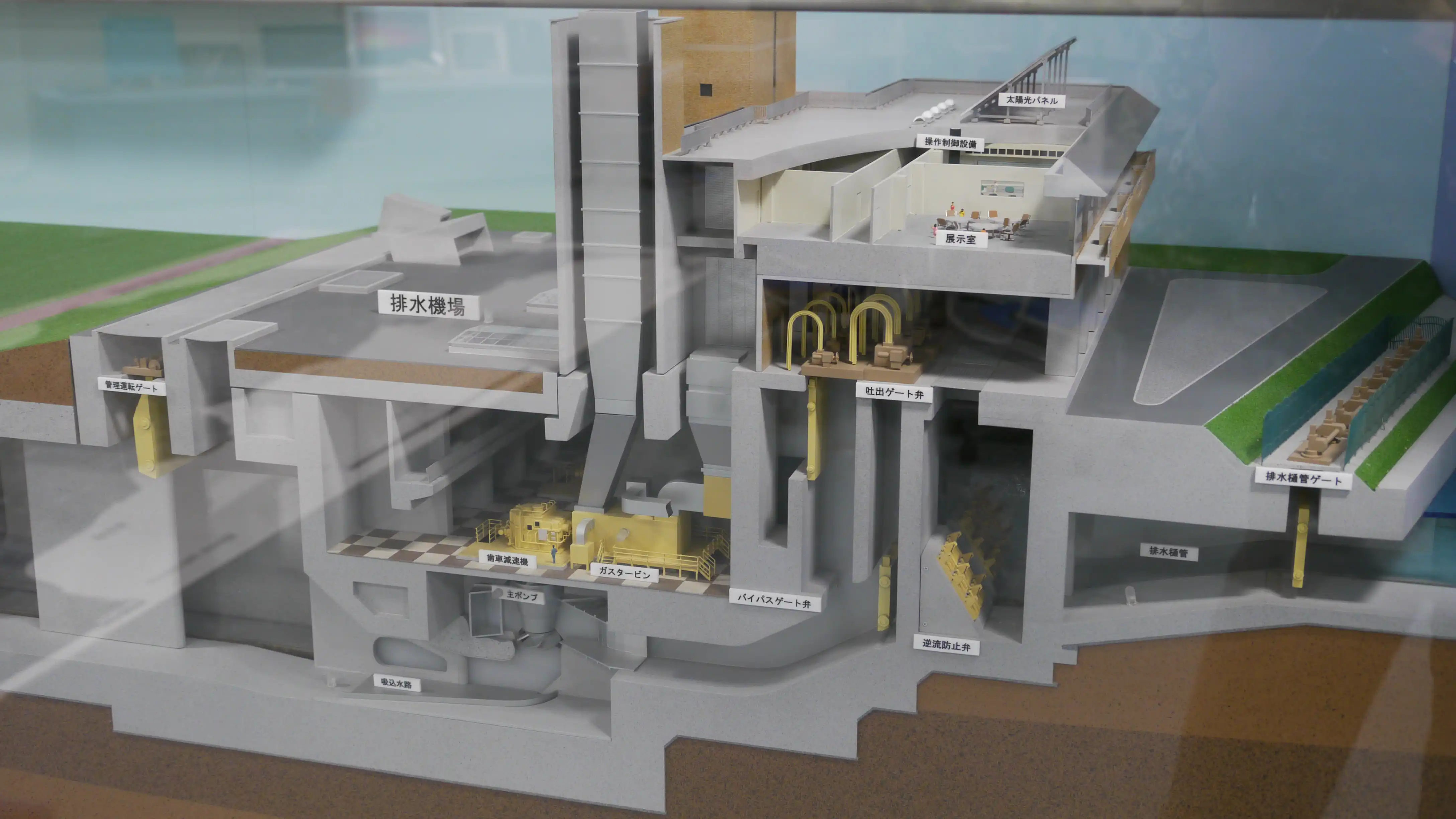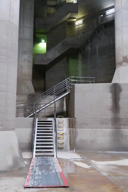 В конце зала расположено четыре гидронасоса, приводимые в движение газовыми турбинами. Общая мощность насосов 10 миллионов 300 тысяч ватт, пропускная способность 200 кубических метров воды в секунду. Крупный олимпийский плавательный бассейн такая система осушит менее чем за минуту.