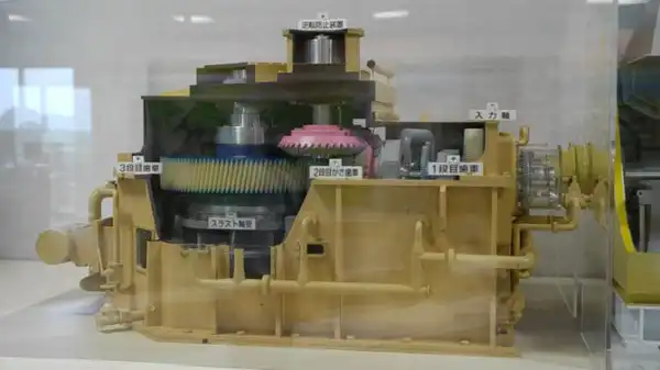 На фотографии действующий макет турбин и редуктора – справа фигурки людей для масштаба.