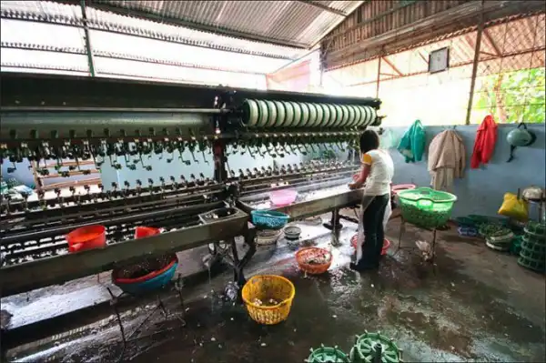 Далее их кладут в длинное корыто с водой, чтобы вытянуть ниточку из каждого.