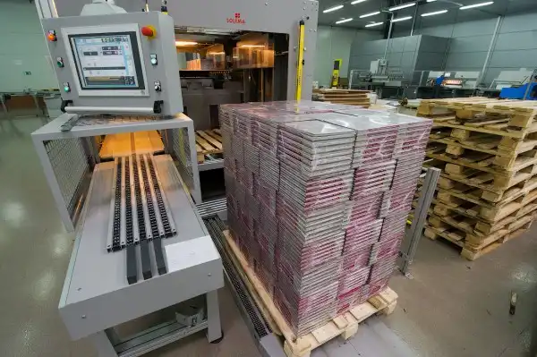 Переплетный цех всегда занимает много места, особенно, когда печатают «толстые» книги и секций для подбора листов много. Есть и полностью автоматические линии твердого переплета, которые за один проход собирают крышку переплета со всеми причиндалами, вроде форзаца, марли и каптала, а потом вставляют в нее книжный блок. Есть линия бесшвейного и швейного скрепления, есть несколько машин фальцовки (складывания) листов, отличная резательная машина «Polar» — самая для меня интересная часть всего послепечатного процесса. Одним словом, здесь есть всё, даже автоматическая упаковка книг в стопы и укладка на европалету. Всё, как в лучших европейских типографиях.