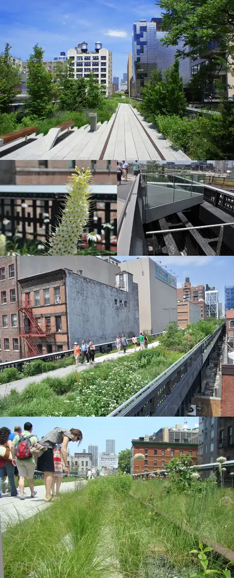 Парк High Line расположен на высоте 10 метров над землёй и проходит по эстакадам над улицами Манхэттена, небольшими площадями и просто пустынными участками, а местами даже ныряет в здания. В пяти местах доступ в парк организован при помощи лифтов, а в четырёх — установлены лестницы (фотографии animalnewyork.com, mankey.eu, nydailynews.com, jaunted.com, Inhabitat, Friends of Highline, joevare/ flickr.com).