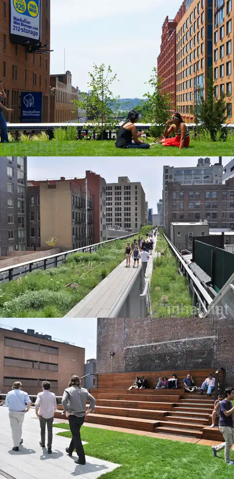 В ряде мест архитекторы намеренно оставили не только собственно рельсы, но и «неухоженные» куски старой железной дороги — для большего колорита и напоминания о прошлом этой линии (иллюстрации James Corner Field Operations, Diller Scofidio + Renfro).