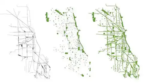 Слева-направо: внутренние железнодорожные линии Чикаго в 1967 году, многие из них ныне остались не у дел; городские парки в конце XX века, в основном, это разрозненные крохотные зелёные пятачки; видение 2030 года – все зелёные зоны соединены в прогулочную «паутину» при помощи парков-линий (иллюстрация Arup, Ross Barney Architects, Michael Van Valkenburgh Associates, Kate Joyce Studios).