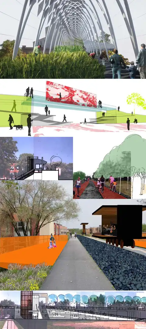 А это несколько набросков висячего парка Чикаго от индивидуальных дизайнеров. Они не отражают текущий проект, а являются лишь пожеланием энтузиастов. Но может что-то из этого компании-подрядчики включат в окончательный вариант (иллюстрации Friends of the Bloomingdale Trail).