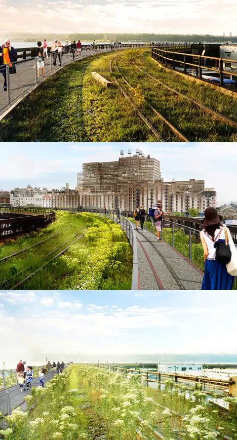Посетителей новой части парка встретят дорожки с пробивающейся местами травой, разнообразные скамейки, качели, водопады, цветы и травы (как аккуратные клумбы, так и участки с дикорастущими сорняками), деревья и смотровые площадки, с которых откроются виды на улицы города и реку Гудзон (иллюстрации James Corner Field Operations, Diller Scofidio + Renfro).