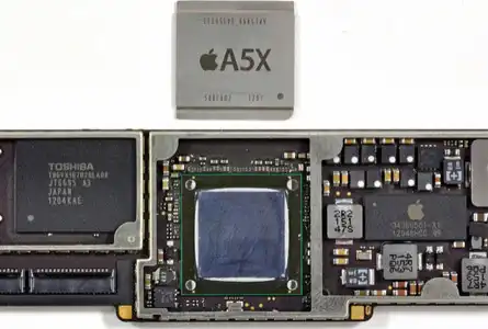Размеры CPU – 12,82 x 12,71 мм. Площадь - 162 мм2, на 36% больше, чем площадь предшественника. 16 ГБ памяти типа MLC NAND набраны чипами Toshiba, произведенными по 24-нанометровому технологическому процессу. Следует полагать, что и в моделях с большей памятью также используются модули Toshiba.