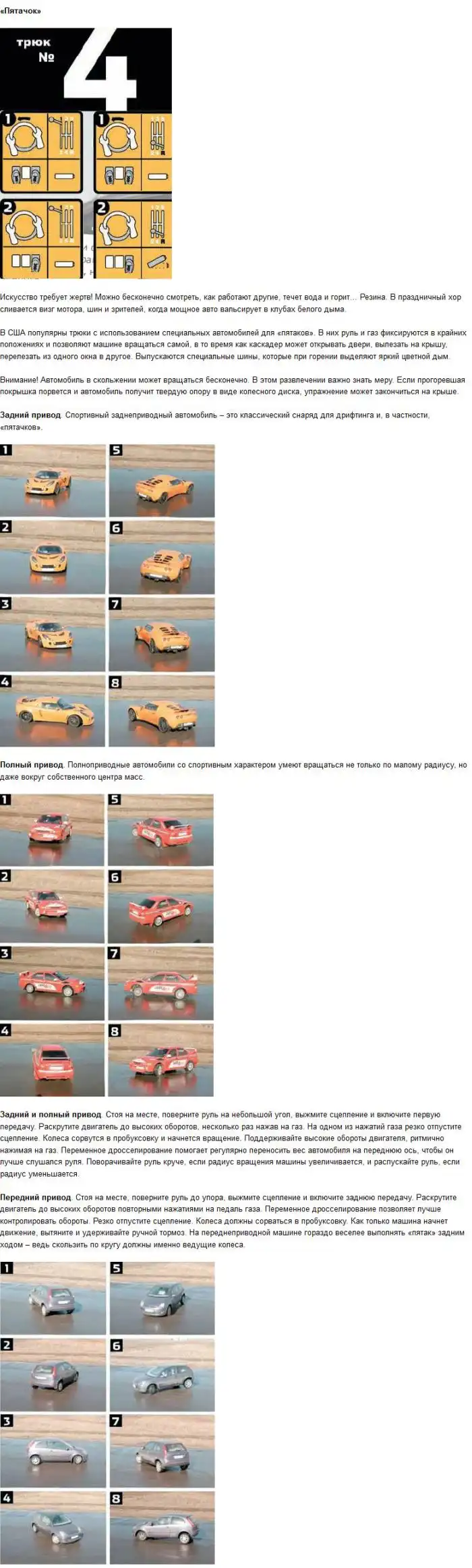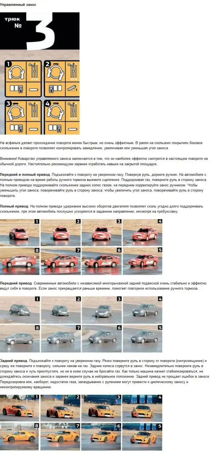 Лучше все это потренировать зимой на свободной площадке на льду, там проще для начинающих и машину не настолько убиваешь)