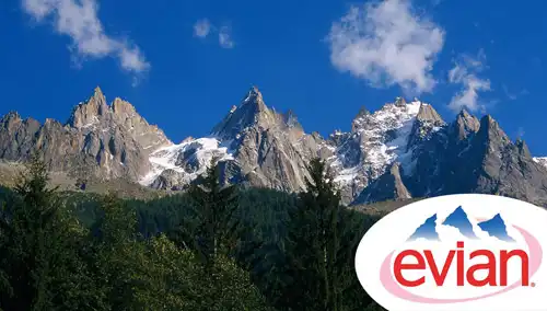 Французская минералка «Evian» названа в честь городка Эвиан-ле-Бен, в окрестностях которого находится несколько источников. Именно здесь, на берегу Женевского озера с живописнейшими видами на Альпы, и разливается по бутылкам известная на весь мир вода. Не мудрено, что на логотип «Evian» попали именно горы. Причем самые фотогеничные - три заснеженные вершины, которые отлично просматриваются из расположенной неподалеку от Эвиана долины Шамони. В центре композиции – гора Монблан (4807 метров), а один из ее соседей - пик Эгюий-дю-Миди, знаменитый не столько своей остроконечной формой, сколько самой высокой канатной дорогой в мире.