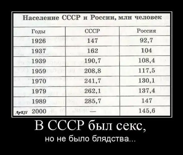 "Секс (лат. sexus — пол) — в широком смысле, деятельность особи, направленная на реализацию инстинкта размножения, продолжения рода." И с этим как раз таки в СССР всё было нормально, достаточно посмотреть статистику рождаемости. И это в условиях пресловутого тоталитаризма. В современной же России, при обилии секса и порнографии во всех СМИ, не говоря уже об Интернете, население катастрофически сокращается.