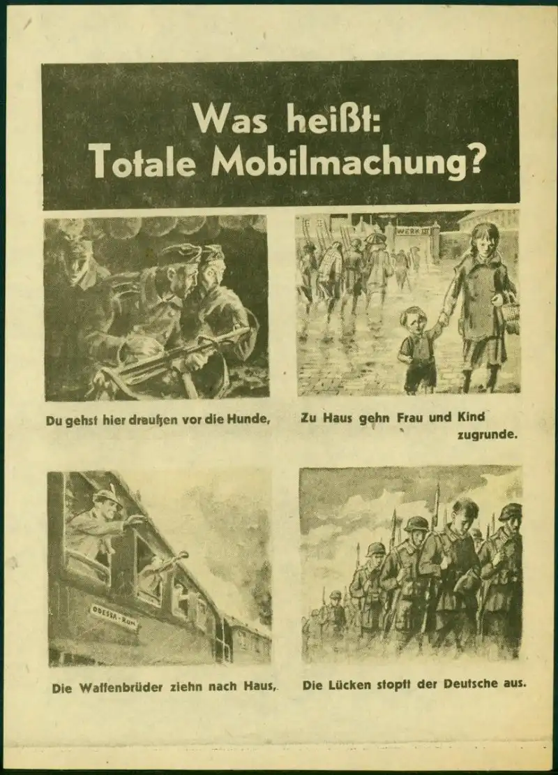 Эта листовка рассказывает немцам о том, что творится у них в тылу – тотальная мобилизация, итальянские союзники отправились домой, а немцами на фронте затыкают все дыры.