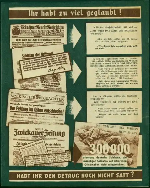 Немецких солдат информируют о зимнем разгроме Вермахта под Москвой. На обратной стороне стандартный «пропуск в плен». Любопытен пароль на русском языке, который должны выкрикивать немцы, решившие сдаться: «Прощай, Москва! Долой Гитлера!»