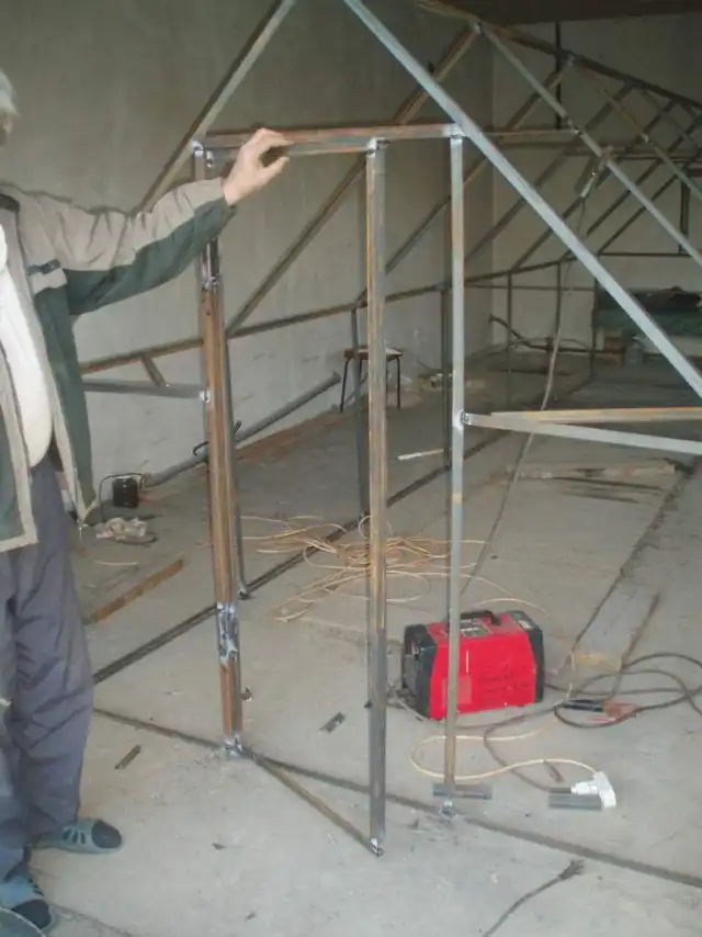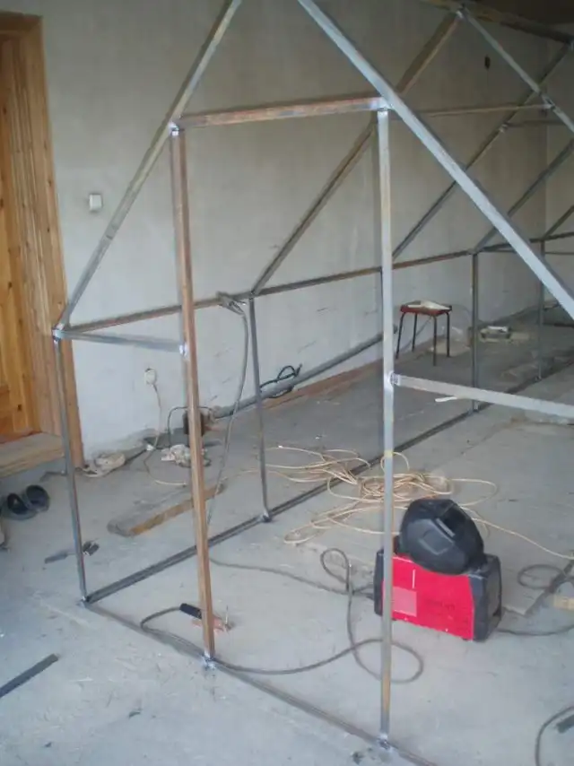 На следующий день, суббота. Просверливаем по всему каркасу дырки. Для крепления покрытия теплицы.