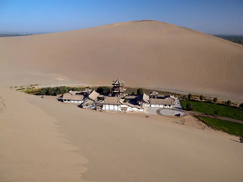 Озеро в форме полумесяца и буддийский храм, которые находятся примерно в 6 километрах от города Дуньхуанг, очень популярны у туристов. На самом–то деле в реальности все несколько прозаичнее, чем на фотографиях, ведь город уже практически рядом с оазисом. Внесенное в список объектов всемирного наследия и находящееся под наблюдением, озеро уменьшилось с 1970 года в три раза: его уровень понизился почти на 8 метров. Правительство провинции заявило, что предпримет все необходимые меры по восстановлению прежнего уровня воды, но какова ситуация с их обещаниями на сегодняшний день пока не понятно.
