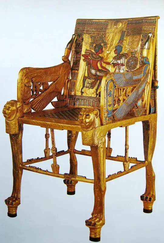 Довольно простая форма, ножки повторяют собой львиные лапы, а подлокотники заканчиваются львиными головами. Деревянная основа трона покрыта листами золота. Спинка с изображением Тутанхамона с женой искусно украшена голубым фаянсом, золотым и красным стеклом.