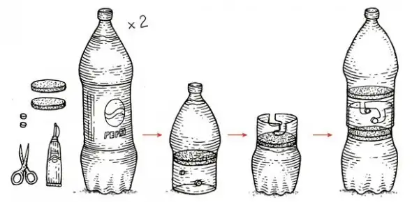 Следующий шаг — взять вторую бутылку и разрезать ее ровно по нижнему краю этикетки. Взять верхнюю часть и аналогично закрепить на ней второй кусок пенопласта, так чтобы он не был виден за этикеткой. Далее чуть ниже пенопласта закрепить две резиновые прокладки, которые будут скеплять вашу бутылку. После чего налить в воду и закрыть крышку. Соединить получившуюся верхнюю часть с нижней так, чтобы разрез и прокладка совпадали, и повернуть ее. Таким образом, между двумя кусками пенопласта у вас образовалось пространство, в котором можно поместить нужные предметы.