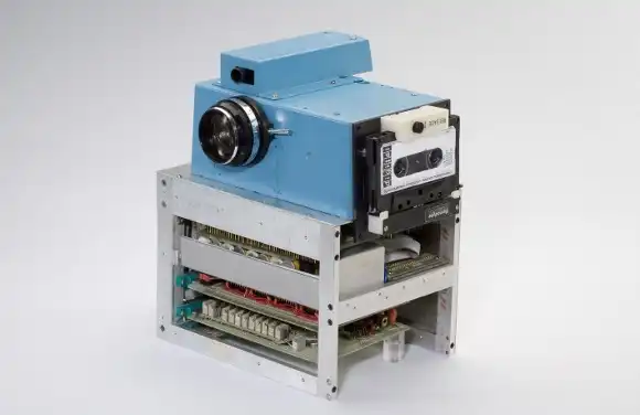 Удивительно, но самая первая попытка сконструировать цифровой фотоаппарат была еще в 1975-ом году, когда инженер Кодака по имени Стивен Сэссон соорудил опытный образец, представленный на фотографии. Используя датчик изображения CCD, машина имела разрешение 10’000 пикселей (0.01 Мегапикселей) и потратила 23 секунды, чтобы сфотографировать черно-белое изображение и сделать запись на аудиокассету.